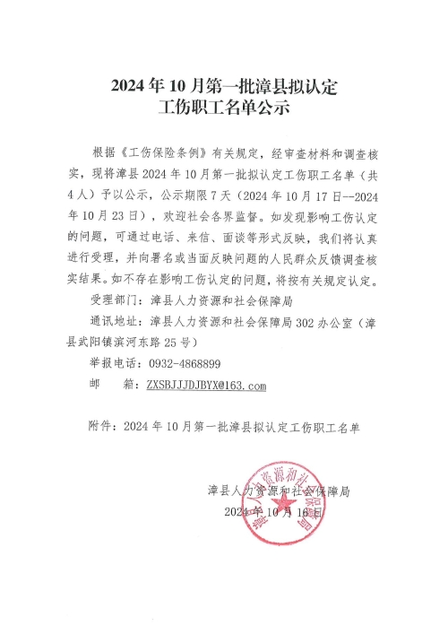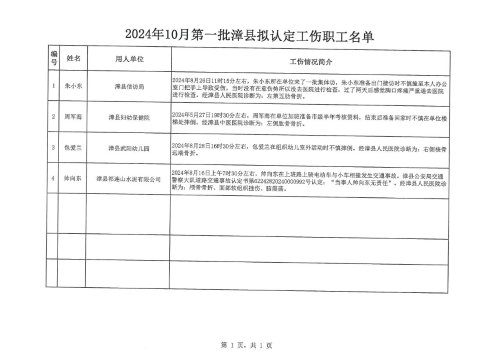 2024年10月第一批漳县拟认定工伤职工名单公示