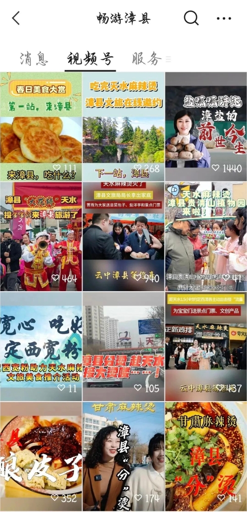 天水麻辣烫火爆出圈之后,漳县文旅局迅速反应,第一时间组织多批次人员前往天水开展推介引流活动,组织人员现场推介漳县旅游资源、展示漳县美食特产、非遗文化,并从漳县的历史文化、美食美景拍摄多部宣传短视频。其中《甘肃麻辣烫“漳县”分烫来啦》《云中漳县等您来》《天水麻辣烫火了!漳县贵清山植物园天水接大“烫”喽!》《漳县“大花轿”天水接宝宝们来漳县贵清山、遮阳山旅游了》等短视频冲上抖音号热搜榜,网民浏览量20万+。