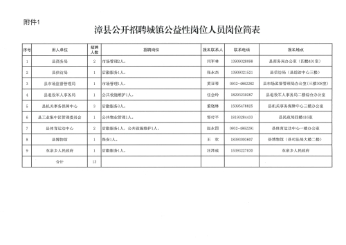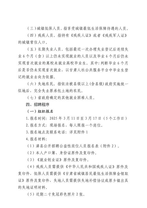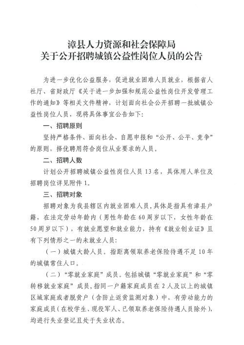 漳县人力资源和社会保障局关于公开招聘城镇公益性岗位人员的公告