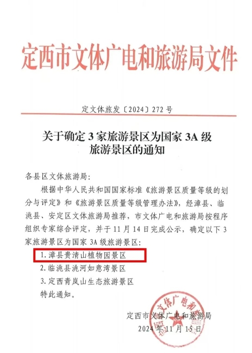 依照《旅游景区质量等级的划分与评定》国家标准与《旅游景区质量等级评定管理办法》,经定西市文体广电和旅游局按程序组织综合评定,漳县贵清山植物园景区成功评定为国家3A级旅游景区。截止目前,漳县有国家4A级旅游景区1家(贵清山/遮阳山国家旅游景区),3A级旅游景区1家(漳县贵清山植物园景区),2A级旅游景区2家(定西市漳县泰山公园景区、定西市漳县石崖寺景区)。 贵清山植物园与国家AAAA级旅游景区、国家森林公园贵清山毗邻而建,距离县城31公里,是一个集休闲娱乐、养生休憩、旅游观光为一体的观赏类森林植物园。项目计划总规划面积3000亩,包括观赏区、种植园区、示范园区和旅游休闲中心等四大功能区,含特色花卉园、名贵药用植物园、观光林业、观光农业、科研及教育培训基地、物种驯化、珍稀植物展示等建设内容。目前已建成名贵苗木基地600亩,栽种苗木70多万株,种植牡丹10万余株、芍药8万株、玫瑰花10万株、郁金香20万株、樱花5万株、海棠10万株,还有紫叶李、白蜡、法桐、玉兰等61个名贵品种,一年四季,花开不败。 |