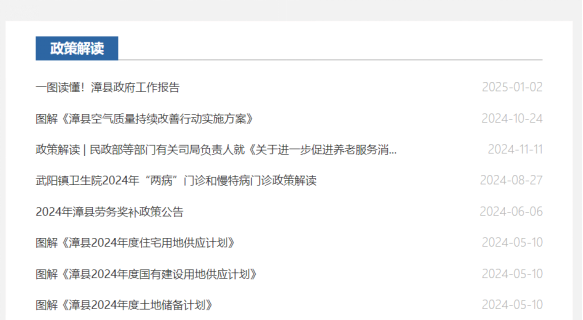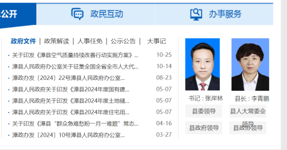 根据《中华人民共和国政府信息公开条例》(以下简称《条例》)和《国务院办公厅政府信息与政务公开办公室关于印发<中华人民共和国政府信息公开工作年度报告格式>的通知》(国办公开办函〔2021〕30 号)规定编制本报告。本报告由总体情况、主动公开政府信息情况、收到和处理政府信息公开申请情况、政府信息公开行政复议行政诉讼情况、存在的主要问题及改进情况、其他需要报告的事项六部分组成。报告所列数据统计期限为2024年1月1日至2024年12月31日。 一、总体情况 2024年,漳县政务公开工作坚持以习近平新时代中国特色社会主义思想为指导,全面贯彻落实党中央、国务院以及省、市关于全面推进政府信息公开工作的决策部署,紧扣县委、县政府中心工作,坚持“应公开尽公开”的基本要求,强化制度机制,细化公开内容,拓展公开范围,规范公开程序,创新公开形式,政府信息公开工作取得积极进展。 (一)主动公开方面。按照“公开为常态,不公开为例外”的要求,全面推行“应公开、尽公开”“应上网、尽上网”,在县政府网站积极主动公开规范性文件、政策解读、建议提案、县政府常务会议等信息5811条。同时,聚焦乡村振兴、项目建设、城乡建设等方面出台的重大政策,严格落实政策文件与解读方案、解读材料同步起草、同步审签、同步发布的“三同步”要求,做到解读信息与政策文件的同步关联,在做好文字解读的基础上丰富政策解读形式,运用图片等解读形式增强解读效果。2024年制作解读信息12条,其中解读材料4条、解读产品8个。高质量办理网民留言50件,其中省长信箱转办12件、书记信箱6件、县长信箱32件,办理情况按要求依法公开25件。
