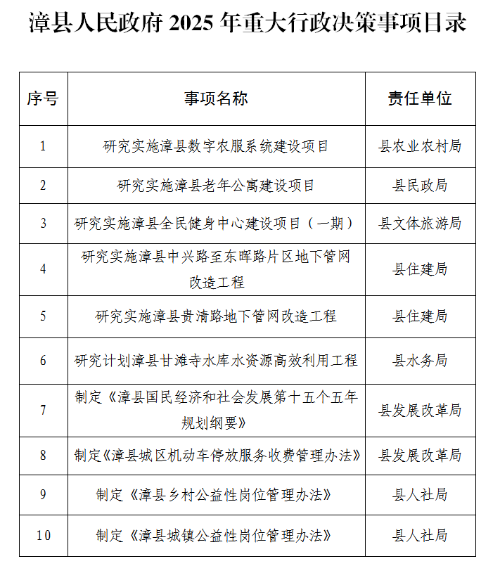 关于印发《漳县人民政府2025年重大行政决策事项目录》的通知 |